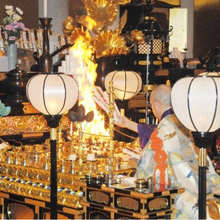 護摩供法要では、本堂に安置されているご本尊・不動明王さまの前に設けた護摩壇において炎を焚き、諸願成就を祈願しております。